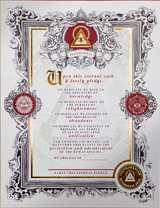 Since our origination, Illuminati members have dedicated themselves to the advancement of the human species by taking oaths of commitment. These pledges are a core tradition of the Illuminati, formed as written contracts between a single person and all members of humanity. The first pledge of the Illuminati is called the Eternal Oath.